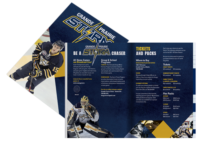 imageDESIGN had a lot of fun creating sporty, dynamic visuals for the marketing and promotion of the Grande Prairie Storm junior hockey team. After starting off with a logo update for their anniversary that maintains the spirit of the current jersey logo, we designed schedules, pocket books, posters, social media posts, gameday sheets, and their program.