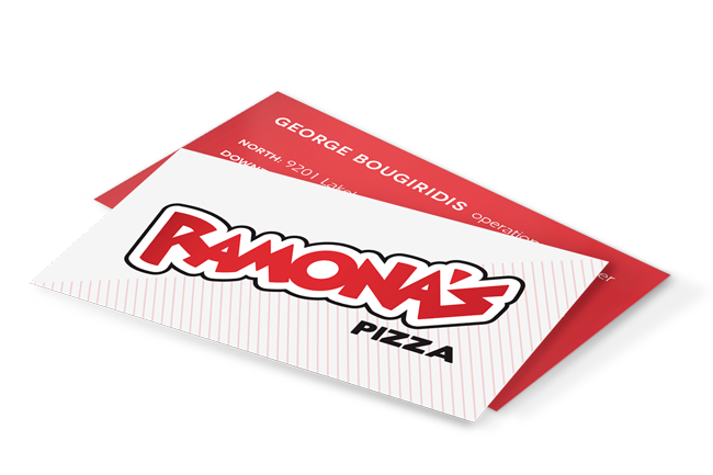 Ramona’s Pizza was looking for a menu design to tie into their new logo and website, so they came to us! We laid out the menu with visual elements breaking up the extensive options, and interpreted special items in unique ways. With our quick inhouse turn-around, we’re able to make sure our client doesn’t run out of menus! Also designed for Ramona’s was an overhead permanent sign menu for their second location and business cards.