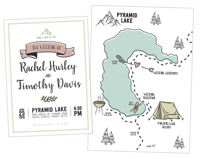 Originally designed for a retro, camping themed photo shoot for the Ultimate Bridal magazine, this wedding invite has gotten quite a lot of attention from local brides-to-be! We love the playful, casual look of this stationery set, from the tent diecut RSVP, to the charming map showing the highlight locations, to the custom envelope and liner.