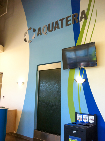 Aquatera provides Grande Prairie with water and wastewater treatment, garbage collection, and recycling services. They wanted to include the branding we developed in a number of their buildings, including their two-storey office in the city. imageDESIGN created vibrant environmental designs, wayfinding, plexiglass signs, window graphics, and painted wall murals. We partnered with a painter, who translated our design onto the office walls.