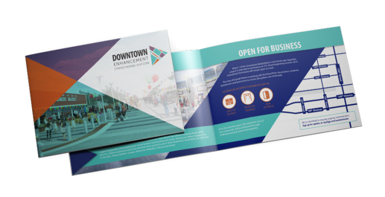 Even when undergoing a major streetscape upgrade, there is plenty to do in Grande Prairie’s downtown core! To show what the enhancement project included, we worked with the City of Grande Prairie to create a booklet that detailed key information of the design and phases of construction. Then, to showcase what is available in our city, we created an easy-to-use map for the Grande Prairie Downtown Association. The front features a map with just some of the many businesses located downtown, while the back is dedicated to two initiatives to encourage exploring the area on foot.